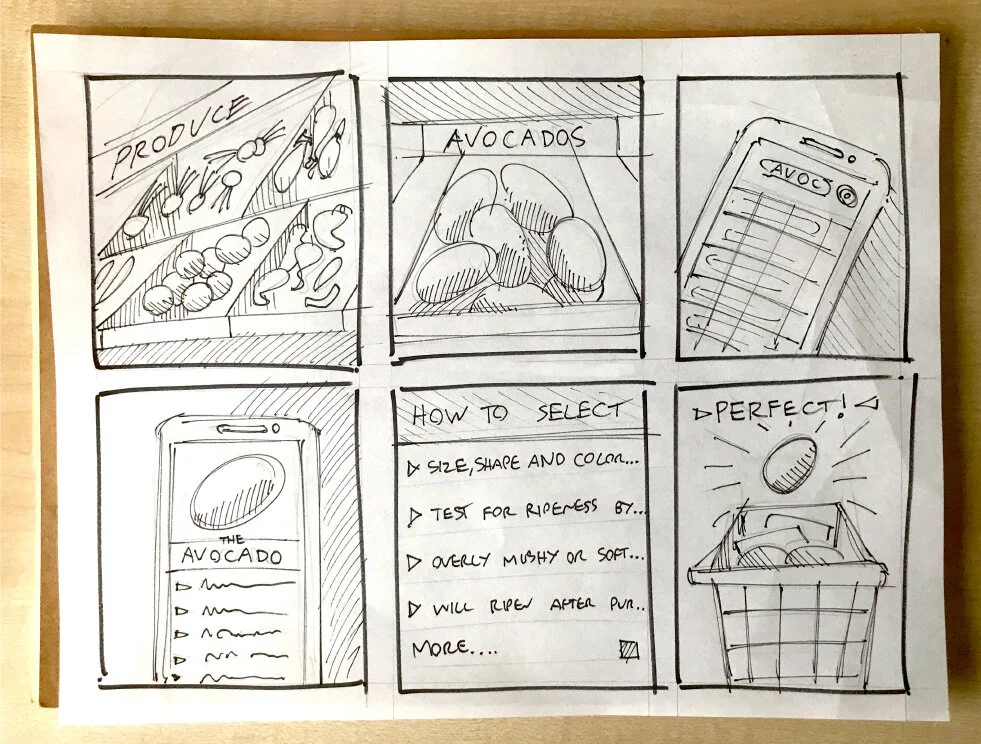 It’s important to remember that the experiences that we are crafting do not occur in a vacuum. The real world is chaotic, messy, and our attention is often divided. I observed people choosing produce at the market, and crafted a simple narrative for how the experience could be improved, in this case by showing how a user could easily access info on how to select an avocado.
